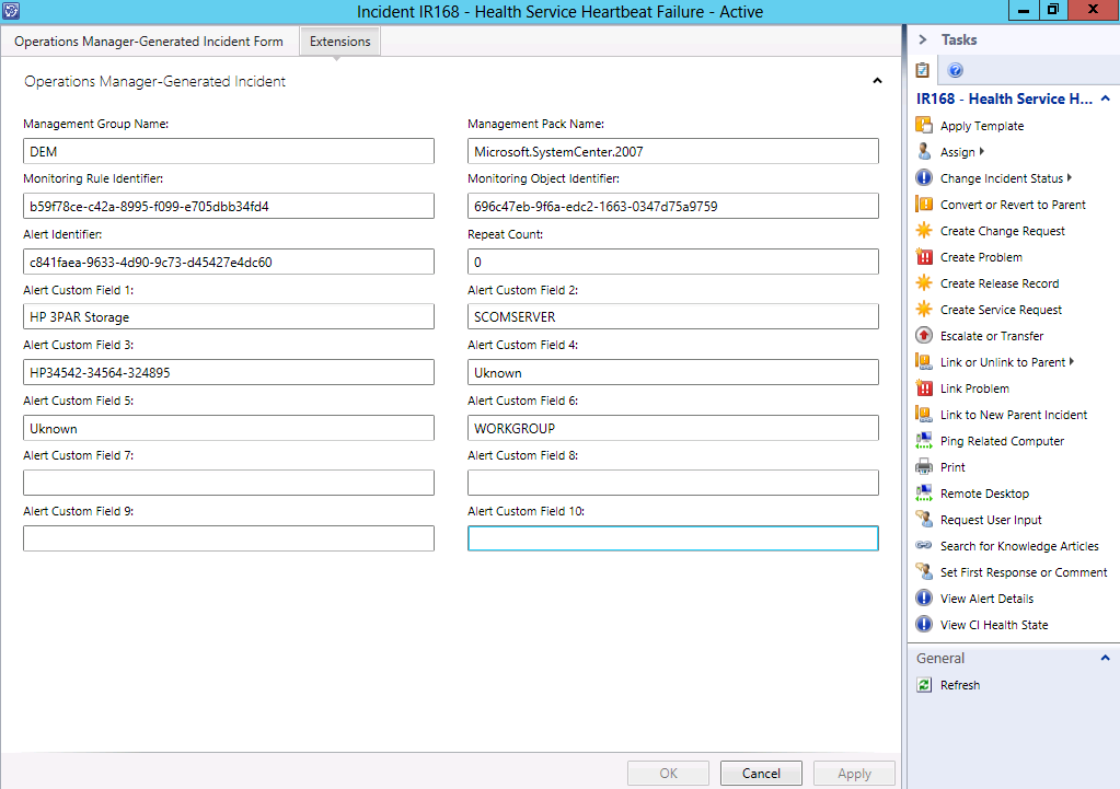 The first thing I wanted to see if Custom Fields properties arrived in SCSM from SCOM properly. This can be seen in the Extensions tab of the incident: