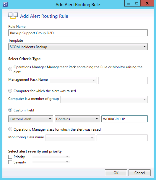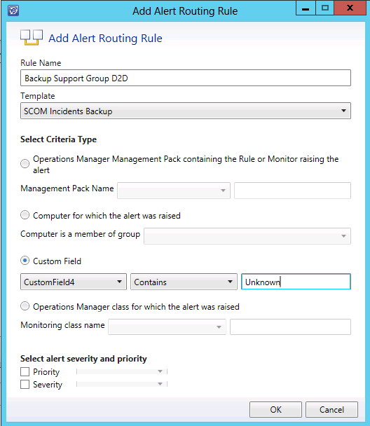 Recently I faced the task to route alerts from SCOM in SCSM to different Support Groups. It seemed like an easy task because in most cases routing is based in Management Pack Name criteria. For example alerts that come from Management Pack that contains “SQL” in its name are assigned to SQL Support Group, alerts that come from Management Pack that contains “BizTalk” in its name are assigned to BizTalk Support Group and etc. You get the idea you can create such routing rule for every Management Pack. Besides this routing rule you can also route alerts based on SCSM groups membership of computer, Custom Fields and Monitoring Classes.
