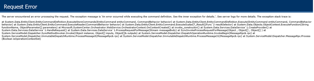 You have SQL server to store the Orchestrator DB. In my case it is SQL Cluster. You have one server where you want to deploy all Orchestrator roles.If you use the installation wizard and deploy all Orchestrator roles at once you will not have this error. The Orchestrator web service will work perfectly fine. But using the all in one installation doesn’t give you the flexibility to have different service accounts. So if you deploy with the all in one installation wizard first the management server and the web features the Orchestrator web service works fine. But as soon you start the installation again and deploy the Runbook server role on the same server the web service starts to give request error upon calling it. Apparently when you deploy the Runbook server role on the management server separately something is changed in the Orchestrator database and the web service stops working. Even if you have other servers with the web service they will also start giving the error.