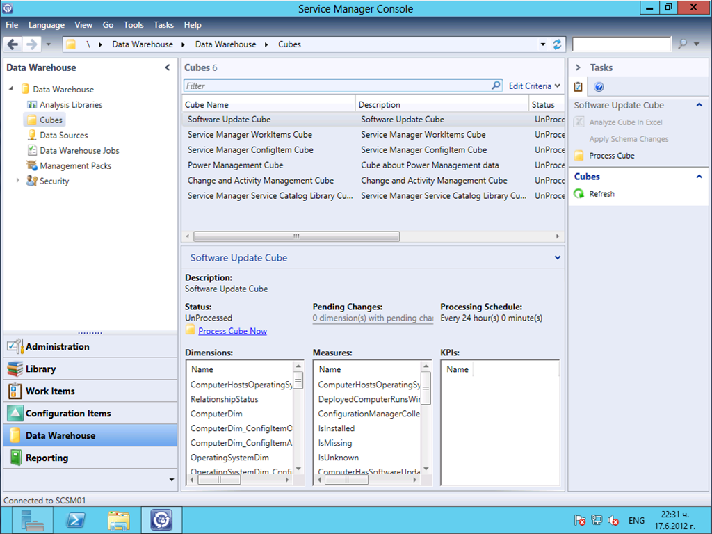 The SCSM Data Warehouse servers is hard for installations. There are certain prerequisites for SQL Reporting Service that have to be done in order to succeed with the installation. I’ve completed these prerequisites, installed 2012 and started the Data Warehouse installation. The installation completed successfully. The virtual machine of the SCSM DW server is named SCSMDW01 and have hardware profile with 1 virtual processor, Startup memory: 1024 MB, Maximum memory: 3096 MB, memory buffer 20% and memory weight set to high. In order to check if all was working properly after the installation I had to register the SCSM DW server for the SCSM Management server in the console. When I did that the Data warehouse jobs started successfully and completed without errors. The result of that is I was able to see the reporting pane and the OLAP cubes in the SCSM console: