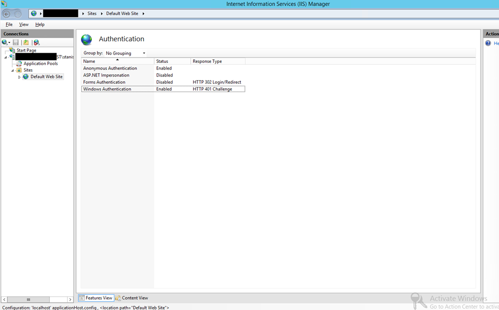 I’ve started IIS Manager and check what authentication methods are enabled. Windows Authentication was disabled so I’ve enabled it: