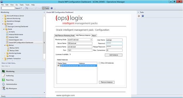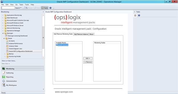 11. Next is to add the node(s) that will act as proxy for monitoring your Oracle database. You go to OpsLogix -> Oracle -> Oracle IMP Configuration Dashboard. The MP automatically detects all your SCOM Windows agents and lists them so you can just select the node(s) that will act as proxy and add them.